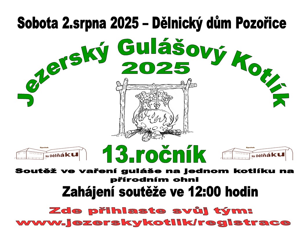 Rok se sešel s rokem a kamarádi nás bombardují dotazy: Kdy budou guláše? Tak tedy...magický 13. ročník gastronomické soutěže ve vaření guláše na jednom kotlíku – Jezerský gulášový kotlík – se bude konat dne 2. srpna 2025 jako vždy v areálu Dělnického domu v Pozořicích. Kdo si chc e ověřit svoje kuchařské umění, může přihlásit svůj tým tradičně na www.jezerskykotlik.cz/registrace. Na těchto stránkách jsou rovněž pravidla a propozice soutěže, kde se dozvíte, že se jedná o soutěž ve vaření toho nejlepšího libovolného guláše dle vlastního receptu a spoustu dalších užitečných věcí ohledně soutěžení. Vše pod dohledem a hodnocením odborné poroty. Pro soutěžící je připravena bohatá odměna od našich sponzorů, pro vítěze pak ceny a poháry a pochopitelně nehynoucí sláva.